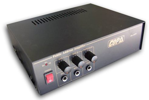 מגבר 40W COPA מתאים למערכות כריזה קטנות (עד 5 רמקולים), בעל 2 כניסות למיקרופון,כניסת AUX אחת ושליטה עצמאית על כל כניסה.